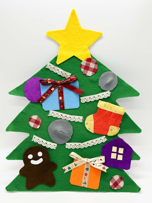 次にプレゼントやくつ下、家、雪だるまなどの飾りをフェルトで作って貼っていこう。