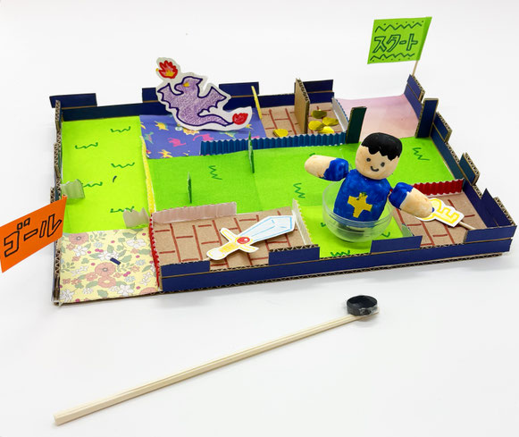 ダンボールの台にコースを作って、カップに入れたモチーフ(人形や動物など)を動かしてみよう。